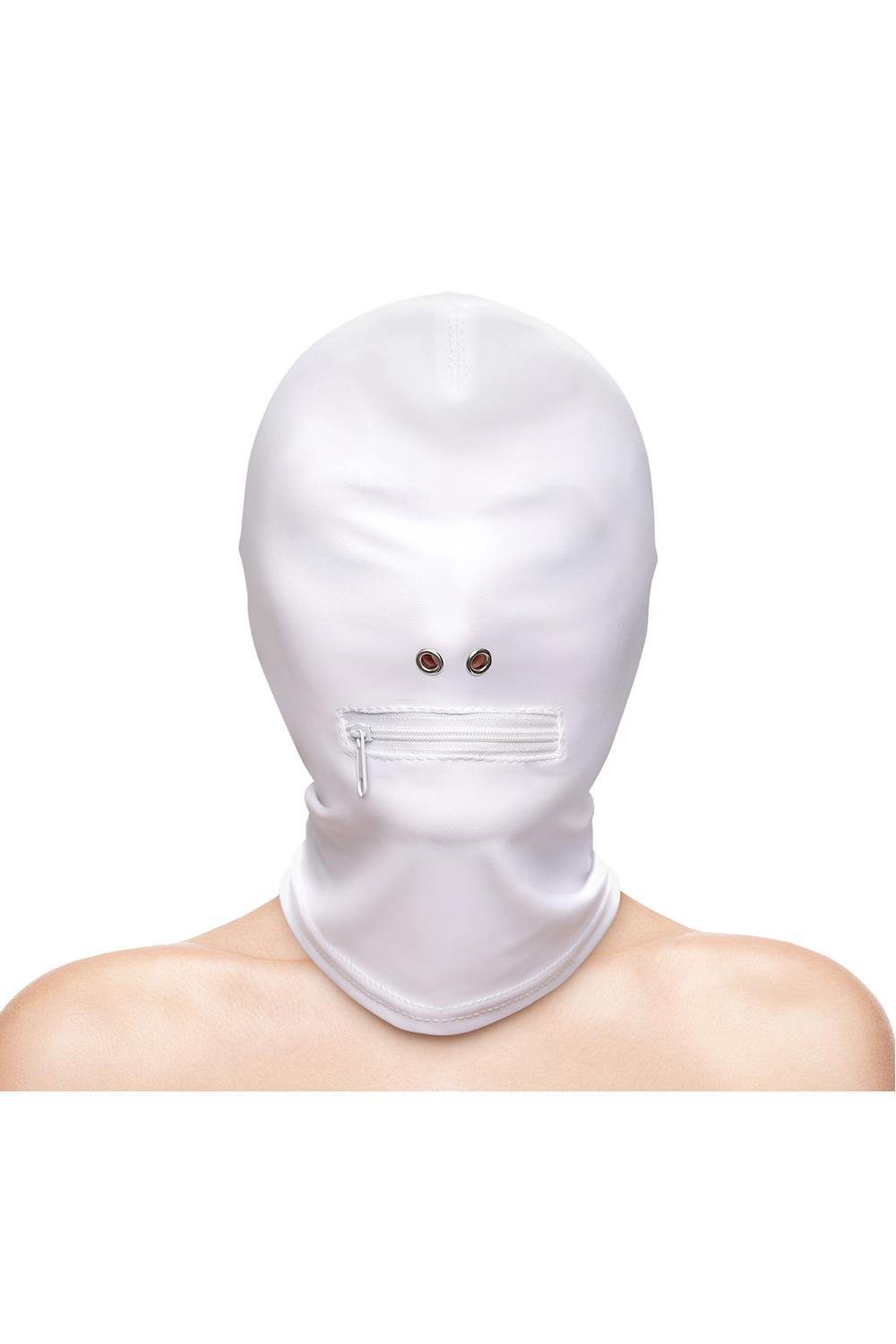 Deze provocerende hood is vervaardigd uit zacht, rekbaar nylon voor een comfortabele pasvorm en voorzien van een nikkelvrije metalen ritssluiting over de mond.