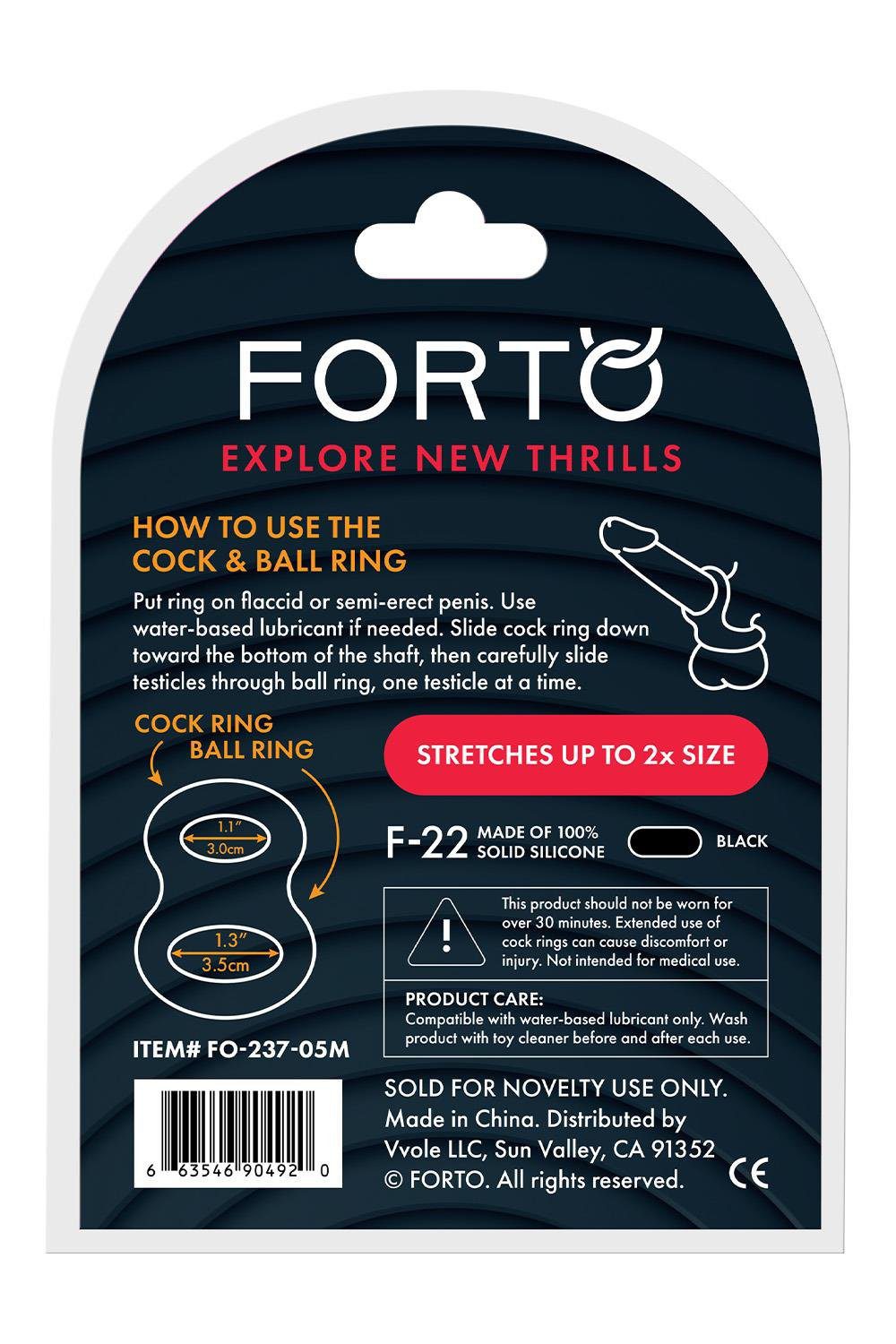 Dankzij het lichte gewicht en het slanke ontwerp is de Forto F-22 discreet onder kleding te dragen. De ring is geschikt voor solo-gebruik, maar ook goed te combineren tijdens samenspel. Voor extra comfort en soepel gebruik wordt aangeraden een klein beetje glijmiddel te gebruiken.