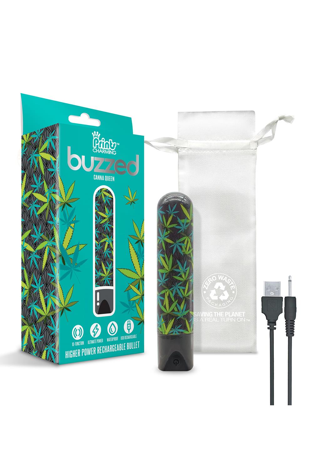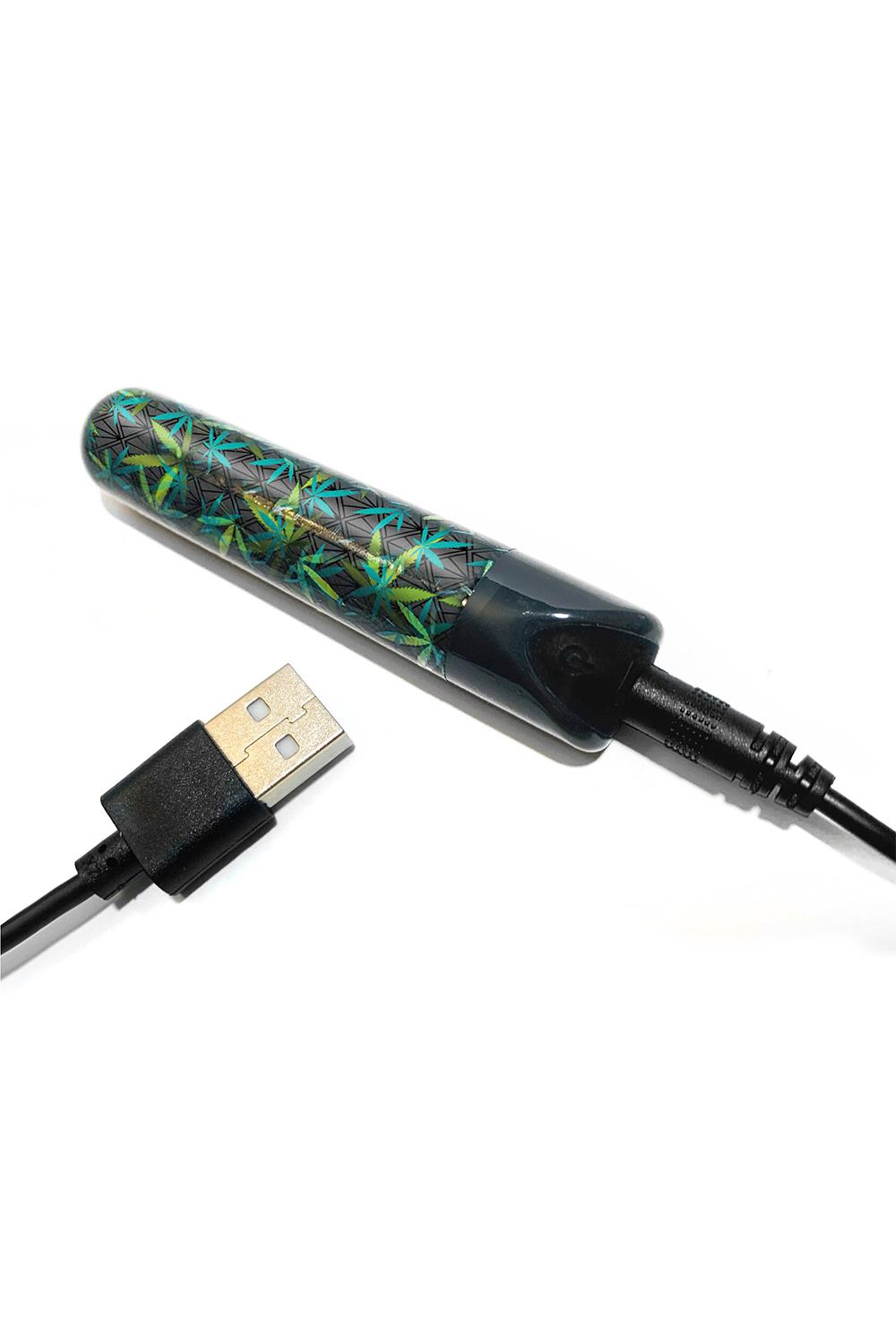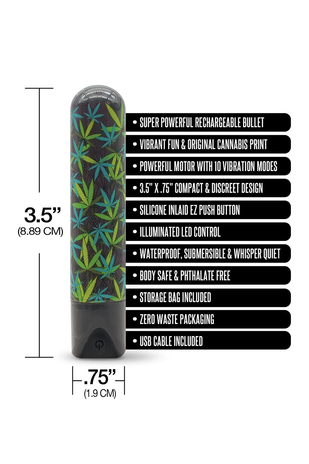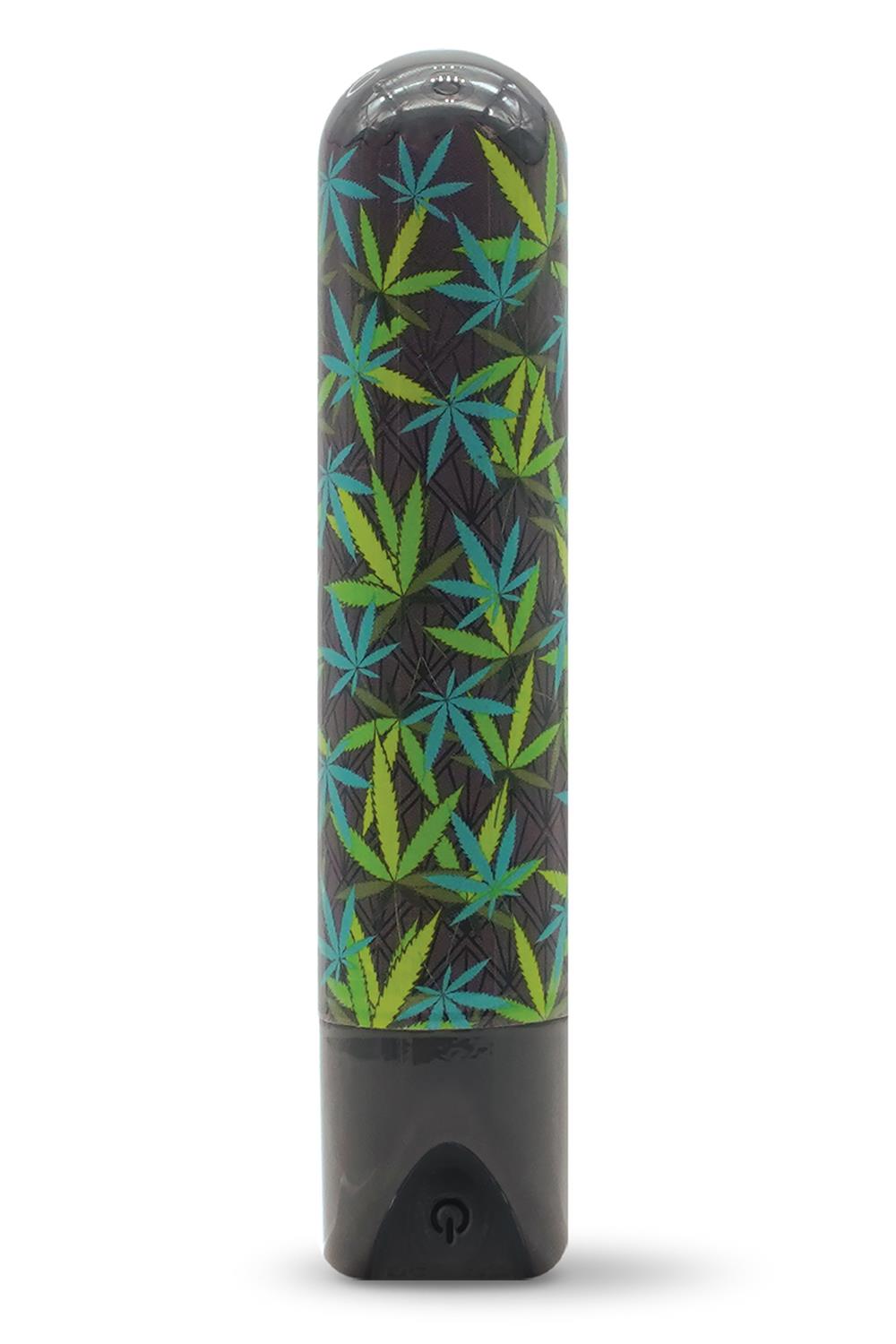 Every day is a good day met deze krachtige, oplaadbare bullet vibrator met vrolijke cannabis-print. Compact, discreet en fluisterstil, met 10 vibratiestanden (snelheden & patronen) en een silicone-inleg drukknop met verlichte LED voor easy control. Volledig waterproof & submersible voor zorgeloos plezier in bad of douche. Gemaakt van body-safe, ftalaatvrij materiaal; basis van ABS. Inclusief USB-laadkabel, opbergzakje en zero waste verpakking.