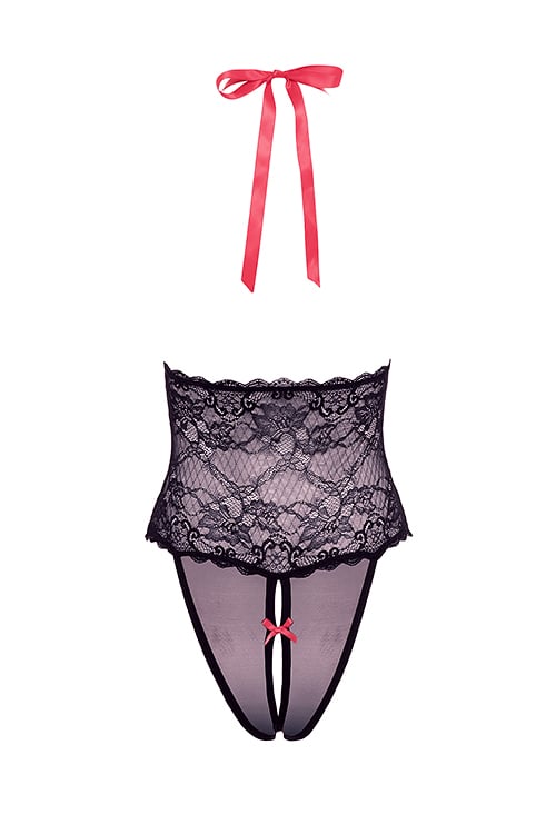 De Barely Bare V Plunge Kant & Mesh Teddy is ontworpen voor maximale impact: een diepe V-hals, verfijnd zwart kant en luchtige
